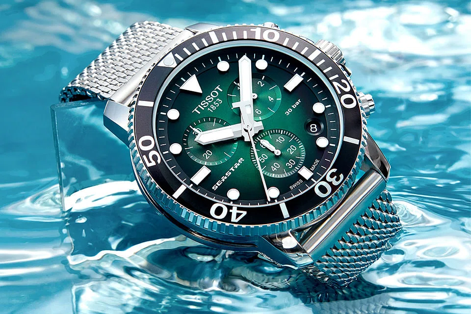 Tissot Seastar 1000 Powermatic 80 "Green is the new blue" introduces style and elegance to the world of water sports with its retro-looking Milanese Mesh bracelet and a green dial - the watch's defining feature. But these don't come at the expense of the watch's performance and functions. It's kept running with extreme accuracy in time-keeping by an automatic Powermatic 80 movement that also offers 80 hours of power reserve. Underwater, the Seastar Powermatic 80 is reassuringly robust and is water-resistant up to 300 metres.