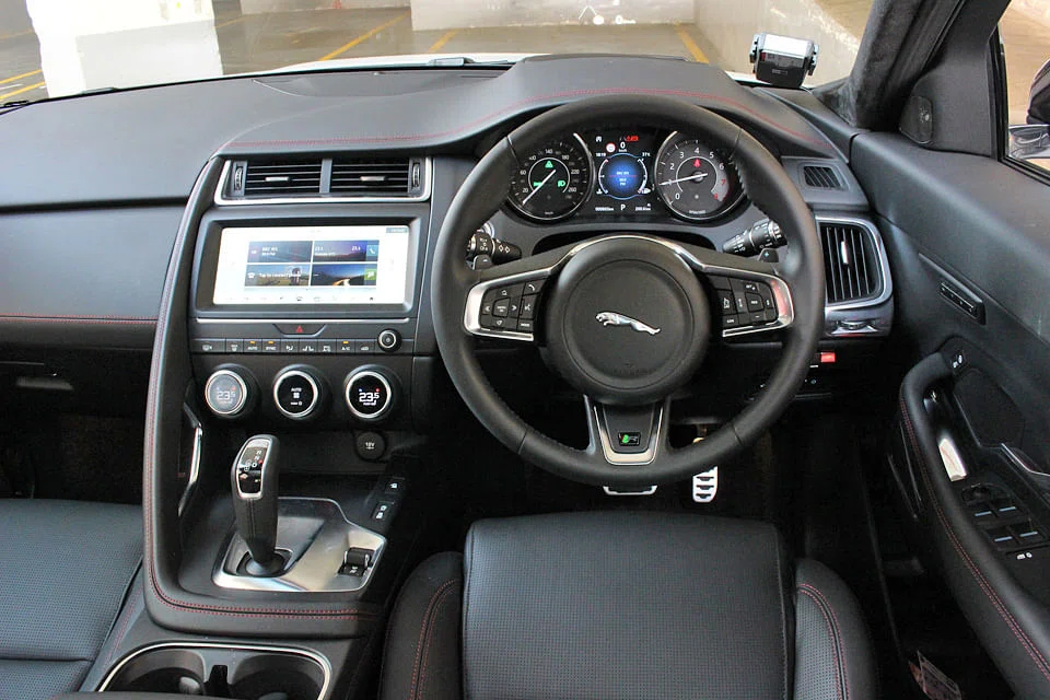 That aspect of its personality is definitely from the Jaguar side of the family. The controls and displays are all focused around the driver, and the cabin looks vaguely related to that of Jaguar's F-Type sports car.