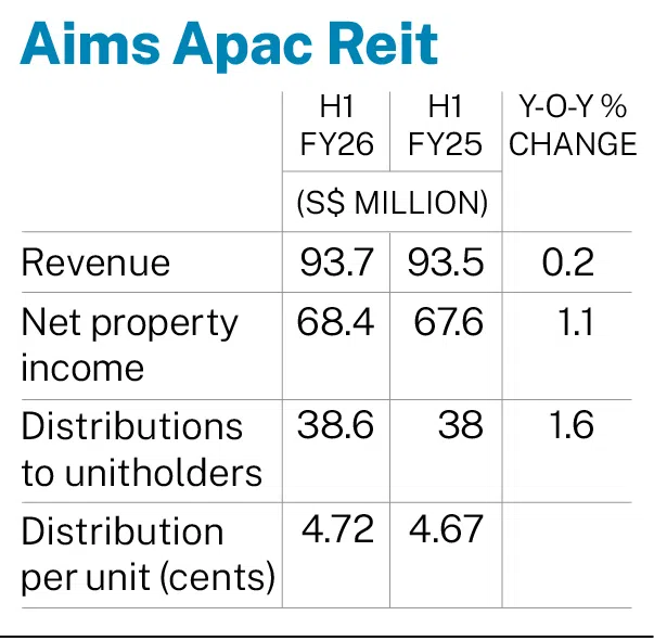 [SINGAPORE] Aims Apac Real Estate Investment Trust (Reit) on Wednesday (Nov 5) posted a distribution per unit (DPU) of S$0.0472 for the first half of FY2026, up 1.1 per cent from S$0.0467 in the previous corresponding period.
