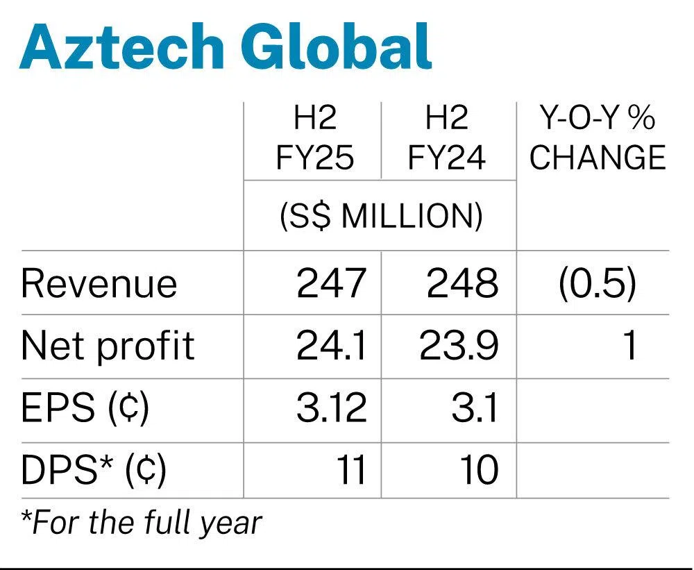 [SINGAPORE] Aztech Global on Thursday (Feb 26) posted a 1 per cent rise in net profit to S$24.1 million for its second half ended Dec 31, 2025, from S$23.9 million for the previous corresponding period.