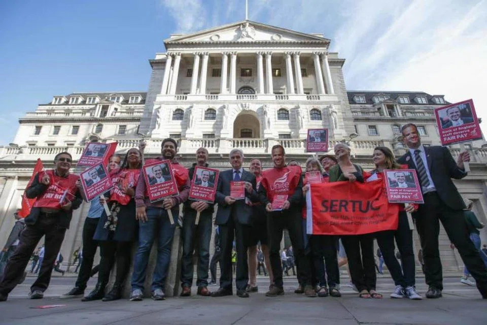 About 15 staff members, some wearing face masks of Governor Mark Carney, staged a picket outside the BoE's central London headquarters on Tuesday. About 150 people work in the departments affected by the stoppage.