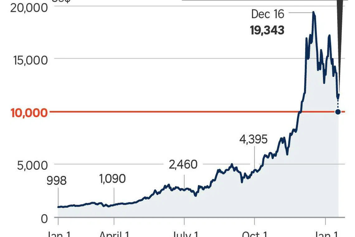 Bitcoin dropped below US$10,000 on Wednesday and was trading 4.8 per cent higher at US$11,234 at 4.53pm New York time. It reached a record high of US$19,511 on Dec 18. Gold was 0.8 per cent lower at US$1,327.