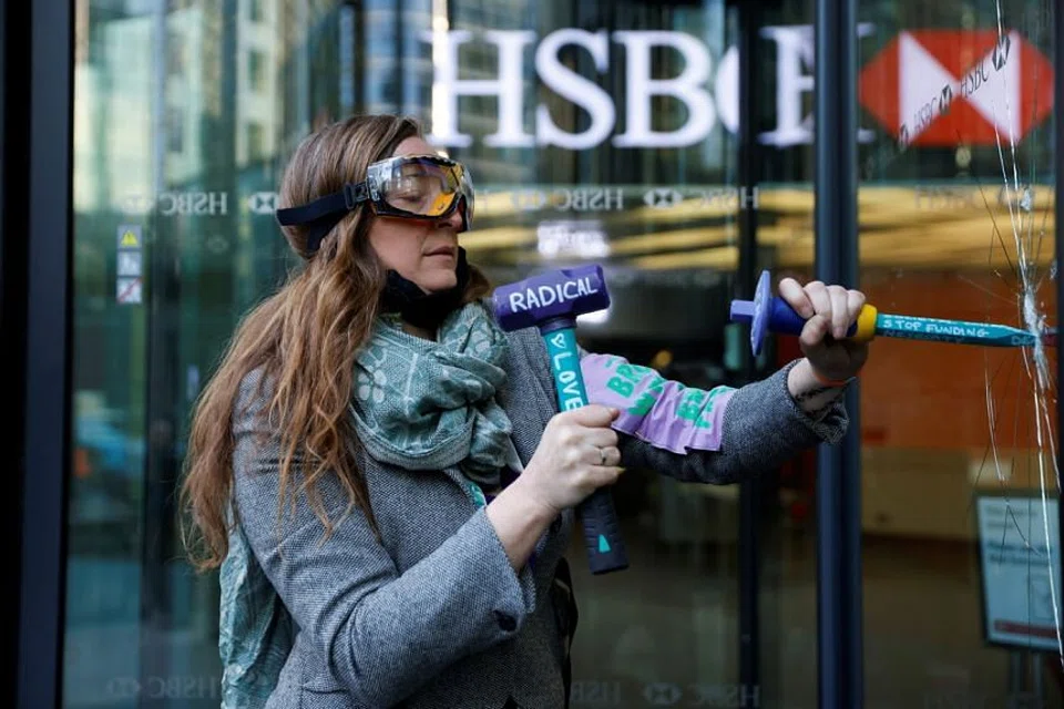 [LONDON] Climate activists shattered 19 windows at HSBC's headquarters in London's Canary Wharf on Thursday as part of a protest against the financing of what the group says is devastating climate change that threatens the planet.