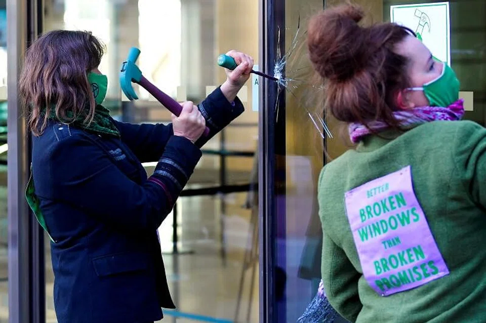 The activists from the Extinction Rebellion group used hammers to break the windows and then pasted the message "In Case of Climate Emergency Break Glass" on the front of the bank's building.