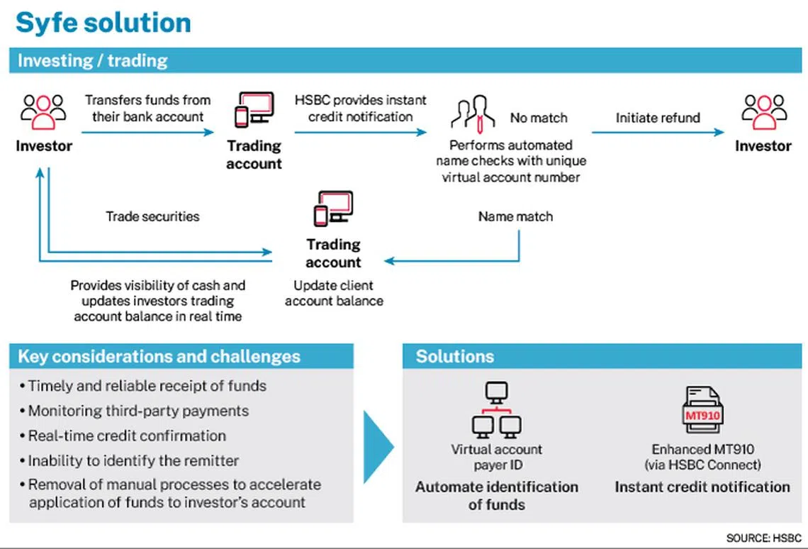 To tackle the problem, Syfe worked with HSBC to co-create a solution that leveraged virtual accounts (VAs) and instant credit notification for its brokerage platform. Once an investor has transferred funds from a bank account to a trading account, HSBC provides an instant credit notification and performs an automated name check with that unique VA number. Where there is a match, funds are directly credited to one’s trading account within minutes.