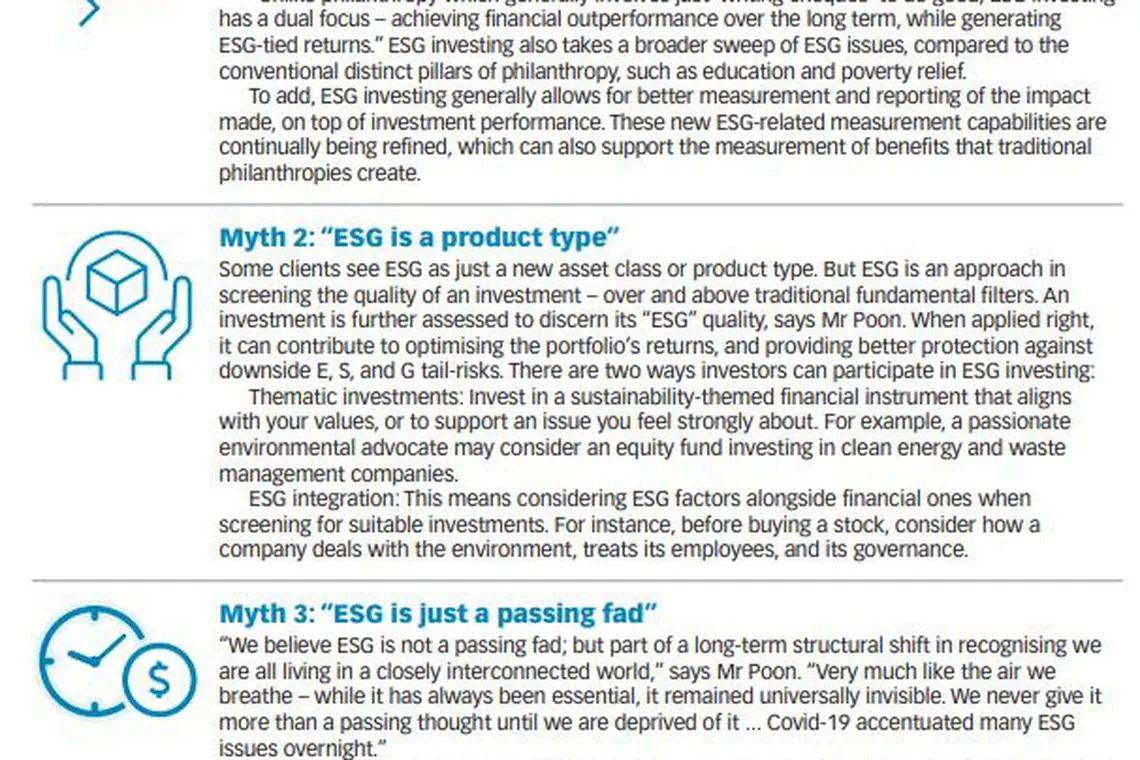 For investors just starting out on investing along ESG lines, Mr Poon noted that ESG is a long-term structural theme. The investment aim is to boost long-term portfolio performance while doing "good".