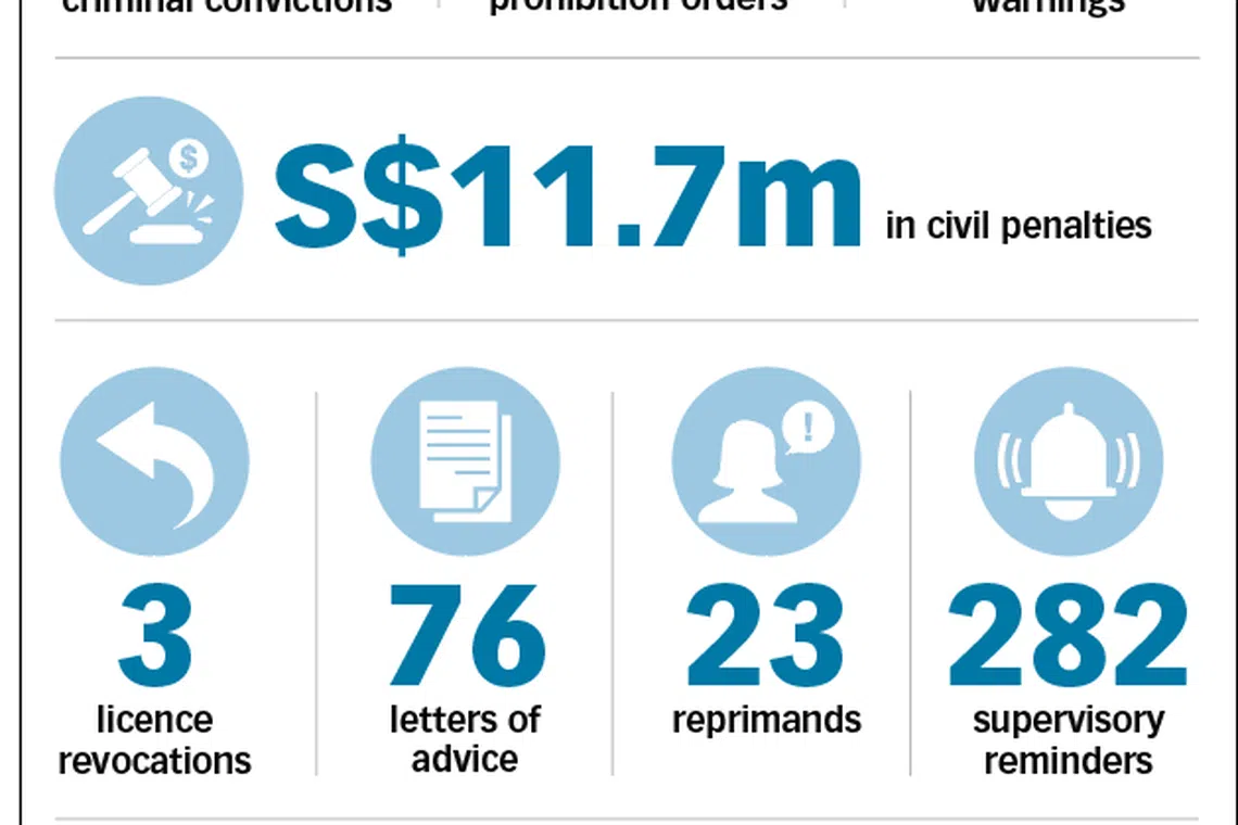 Between January 2019 and June 2020, MAS imposed a total of S$11.7 million in civil penalties for cases of misconduct in trading and failure to disclose shareholdings, while some S$3.4 million in financial penalties and settlements were slapped on 18 financial institutions in Singapore.