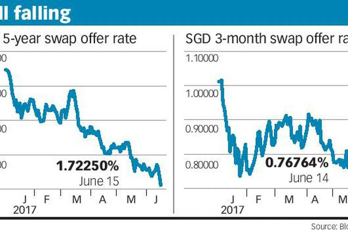The key three-month swap offer rate (SOR) fell to 0.76764 per cent on Wednesday, going back to mid-May levels. The five-year swap offer rate - a popular benchmark for local bonds - tumbled to a year-to-date low of 1.721 per cent on Thursday, down 66.4 basis points from the beginning of 2017. SORs are typically used to price commercial loans.