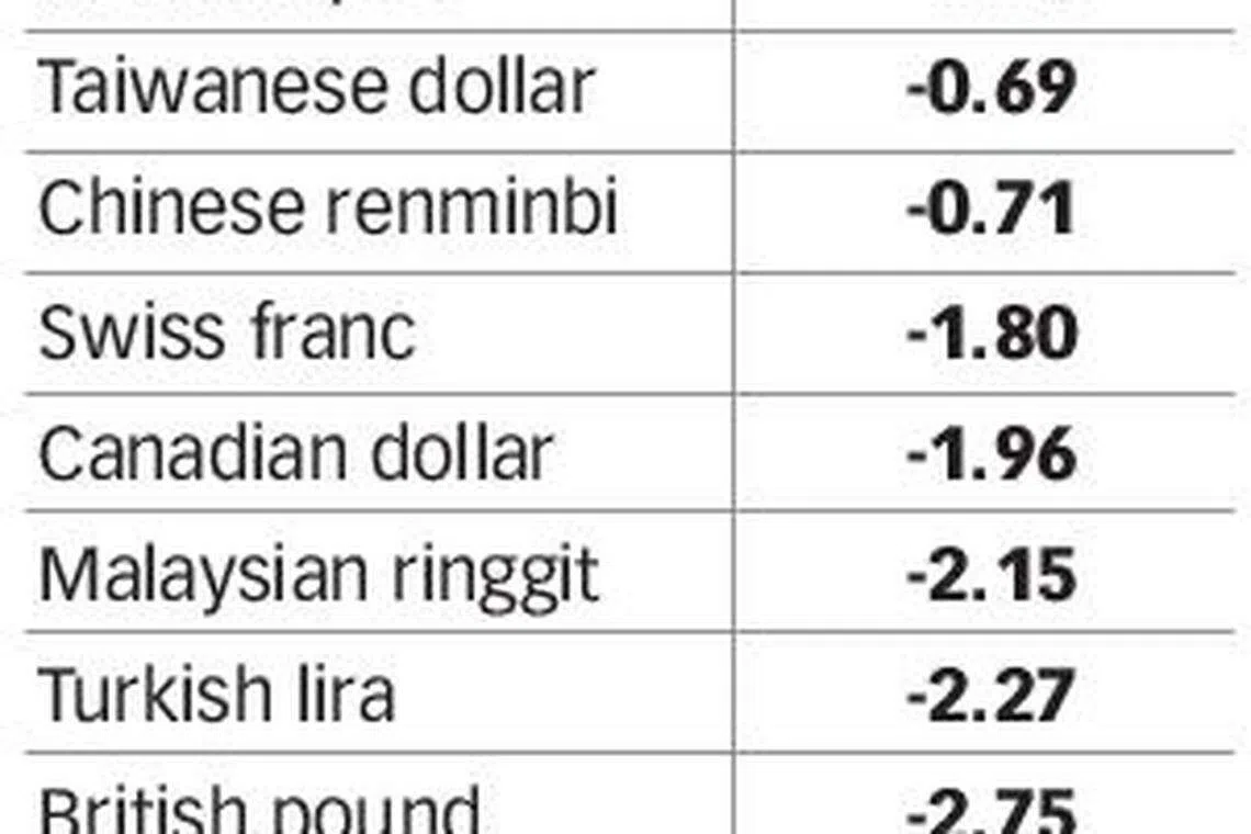 The battered SGD has lost 3.9 per cent since the 1.35 level at the end of 2019. Against its peers, the SGD is among the worst performers, ranking 16th out of 20. Only the Thai baht, New Zealand dollar and Australian dollar have fallen more.