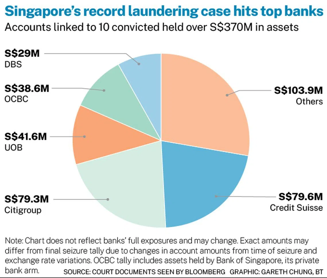 The 10 convicted individuals were linked to accounts across 16 financial institutions operating in Singapore that held more than S$370 million in deposits and investments. The banks that held the most assets include Credit Suisse, Citigroup’s local unit and UOB.