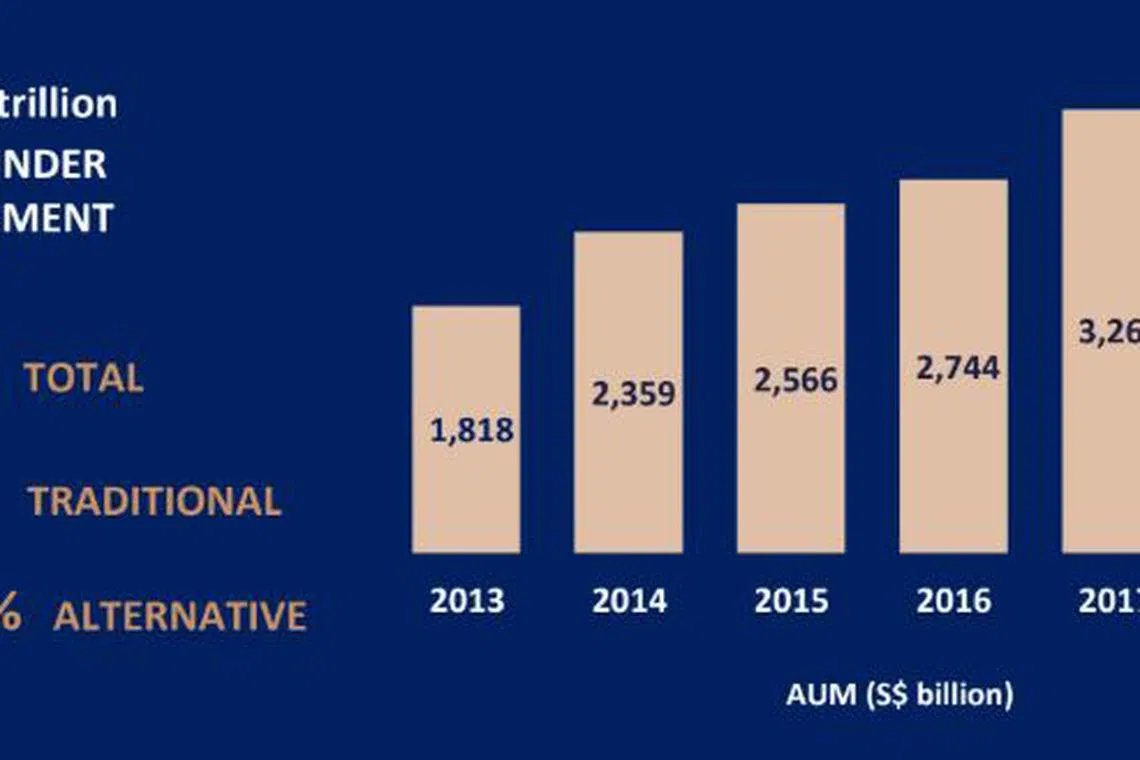 However, it is a milder increase than in 2017, when Singapore's AUM had surged almost 19 per cent to S$3.26 trillion from S$2.74 trillion in 2016.