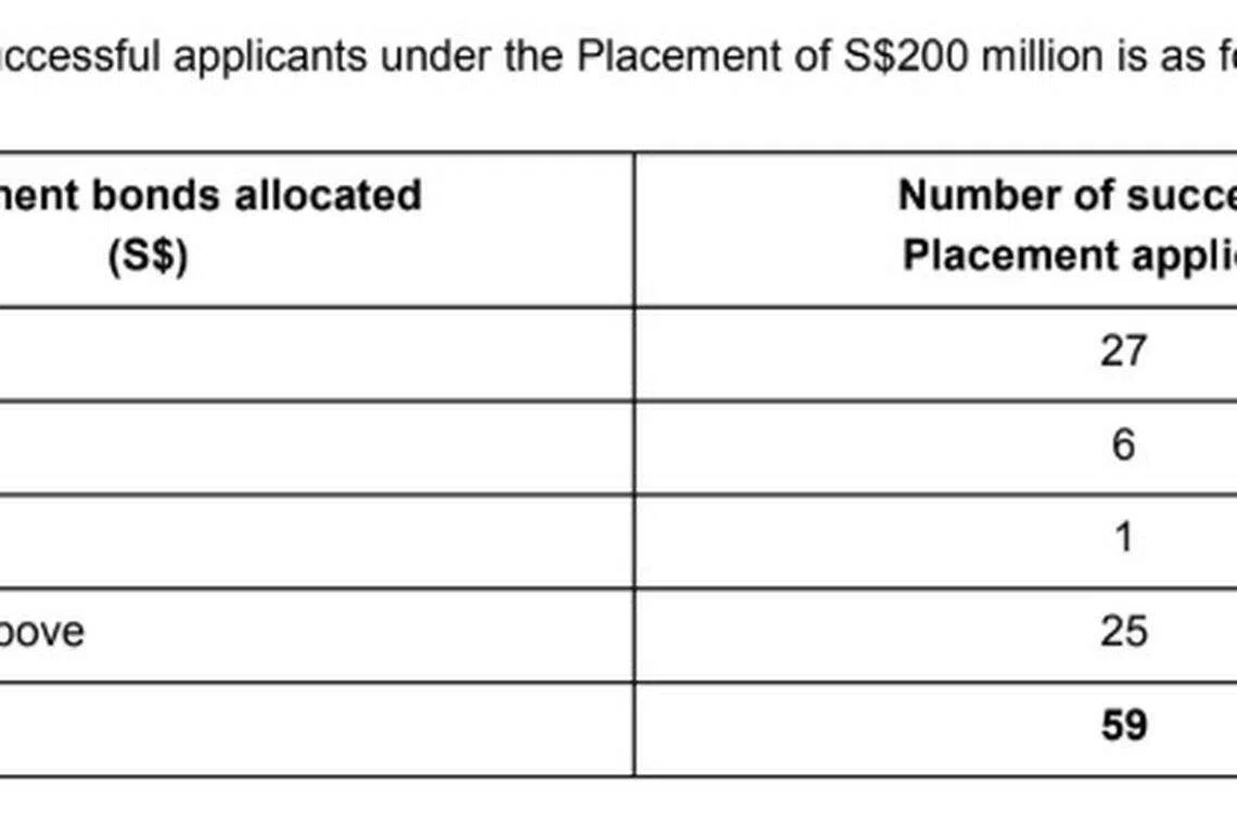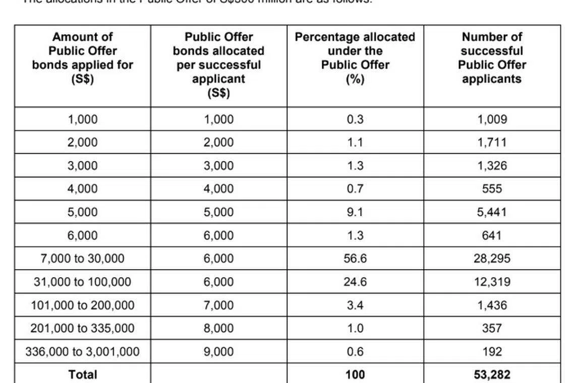 Invalid applications, or applicants who did not receive the full allocation for which they applied, will have their application amounts or the balance refunded without interest, and credited to their DBS, POSB, OCBC or UOB bank accounts within 24 hours after the balloting of the public offer bonds.