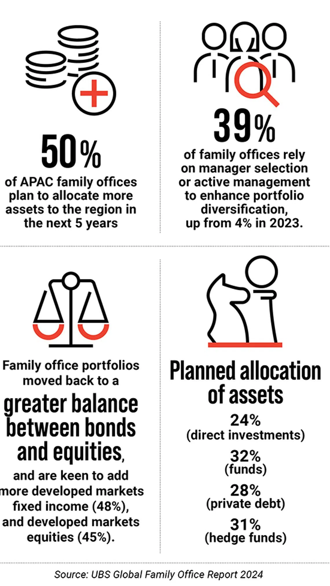 The UBS survey also found that family offices in Asia Pacific (APAC) planned to increase their allocation in alternative assets, such as private equity, private debt and hedge funds in the next five years to further diversify their portfolios.