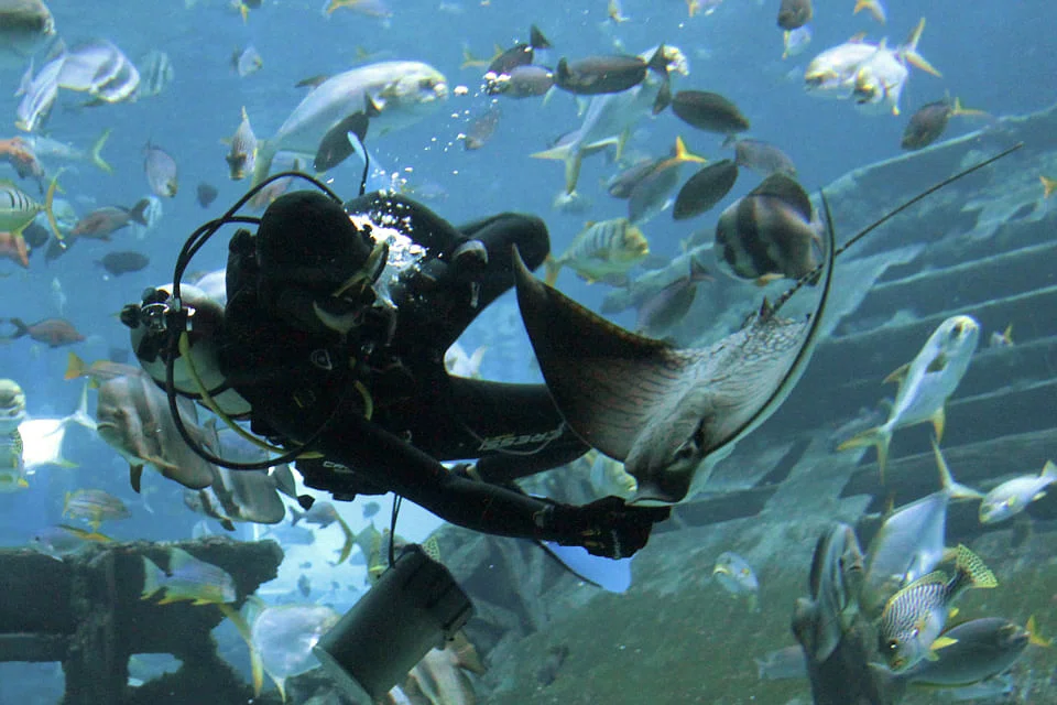 At the aquarium, the 100,000 marine animals there continue to receive care by aquarists who work daily in different shifts. Besides feeding the marine life, they also vacuum the tanks and clean the giant viewing panels.