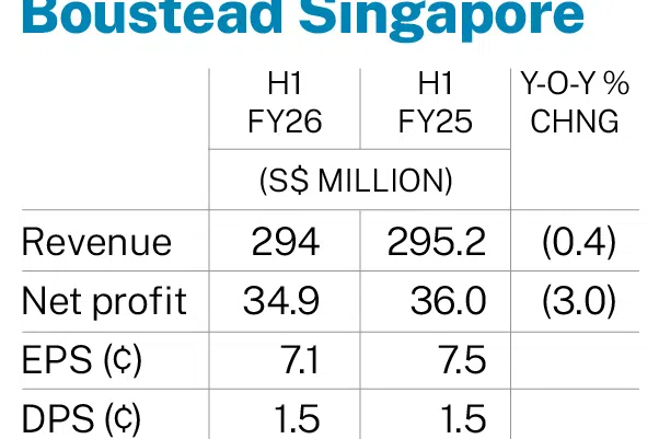 [SINGAPORE] Mainboard-listed Boustead Singapore ’s net profit for the half-year ended September fell 3 per cent year on year to S$34.9 million, from S$36 million.