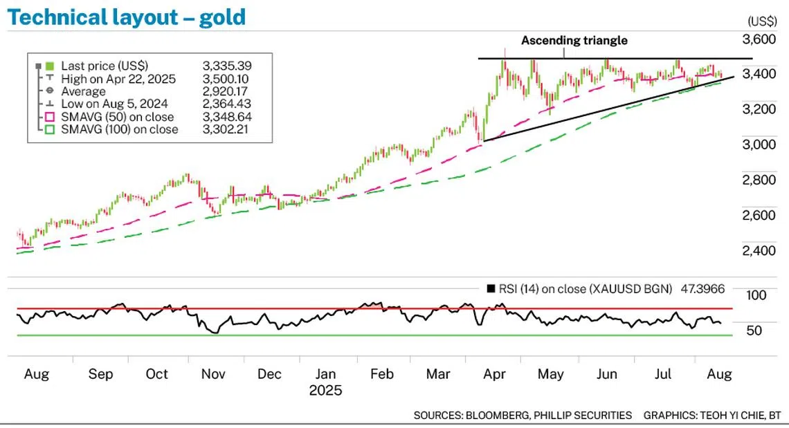 - Resistance levels: US$3,445 (top of triangle), US$3,500, US$3,600.