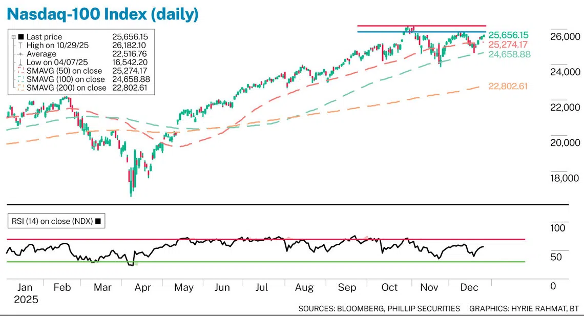 In summary, the NDX as of late December 2025 remains technically positioned to edge higher, supported by key moving averages and seasonal patterns. However, the strength of the advance has eased compared with earlier in the year, and the twin hurdles at key resistance levels of 25,830 and 26,180 will be critical gauges for directional conviction.