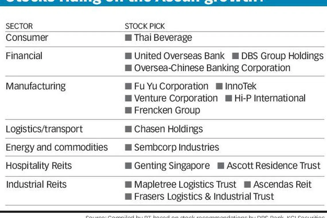 Analysts are therefore pointing to a number of Singapore Exchange (SGX)-listed stocks that may ride the Asean growth story, particularly in sectors driven by domestic demand and consumption.