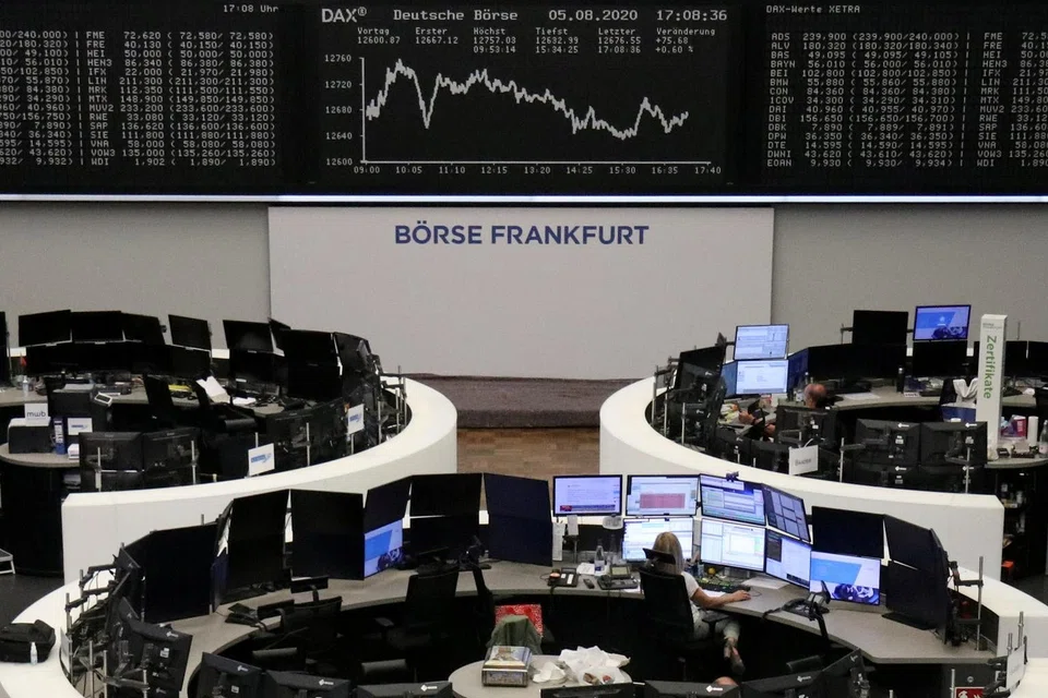 [BENGALURU] European shares ended Monday lower, weighed down by weak financial stocks after disappointing German and Italian inflation data, but closed August higher thanks to optimism over new stimulus measures and a Covid-19 vaccine.