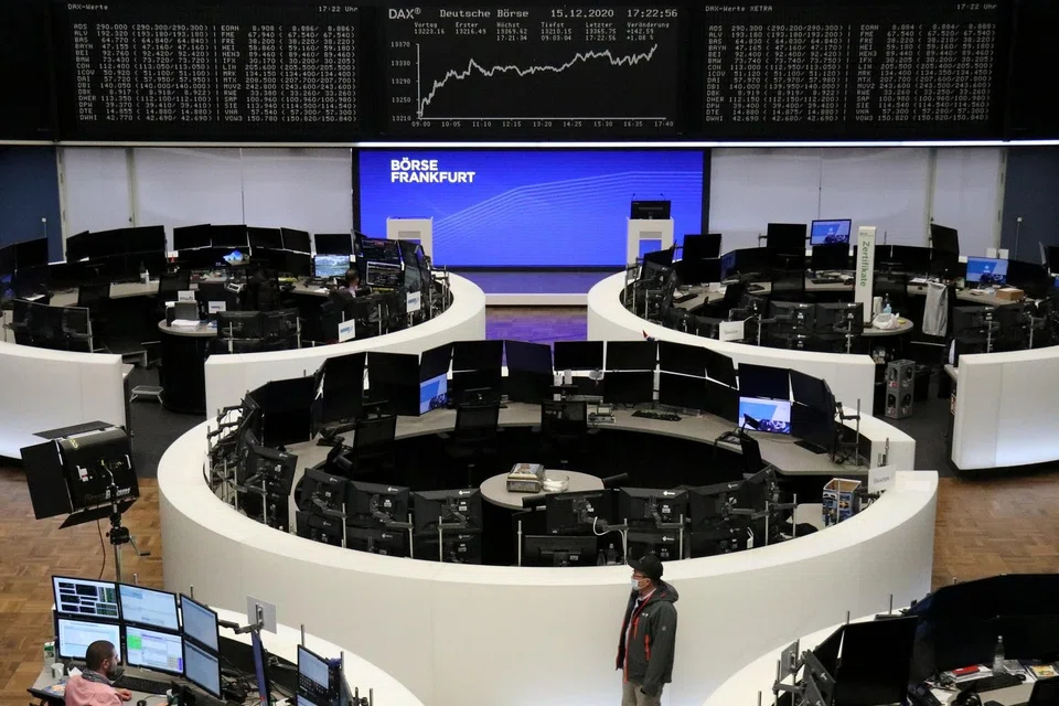[BENGALURU] European shares marked their strongest close in 10 months on Monday, with German shares hitting a record high as relief over long-awaited US coronavirus relief, a Brexit trade deal and a vaccine programme lifted spirits in thin holiday trade.