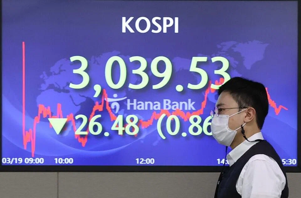 The benchmark Kospi closed down 4.07 points or 0.13 per cent at 3,035.46, having fallen as much as 0.66 per cent to its lowest intraday level since March 11. It ended 0.86 per cent lower on Friday.