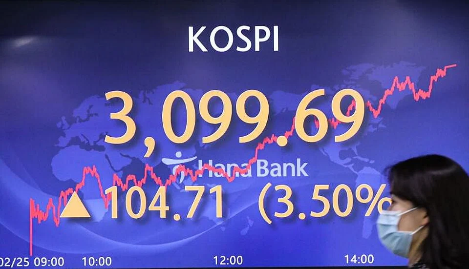 The benchmark Kospi closed up 104.71 points or 3.50 per cent at 3,099.69, marking the biggest daily gain since Jan 8, after recovering from a 2.45 per cent decline in the previous session.