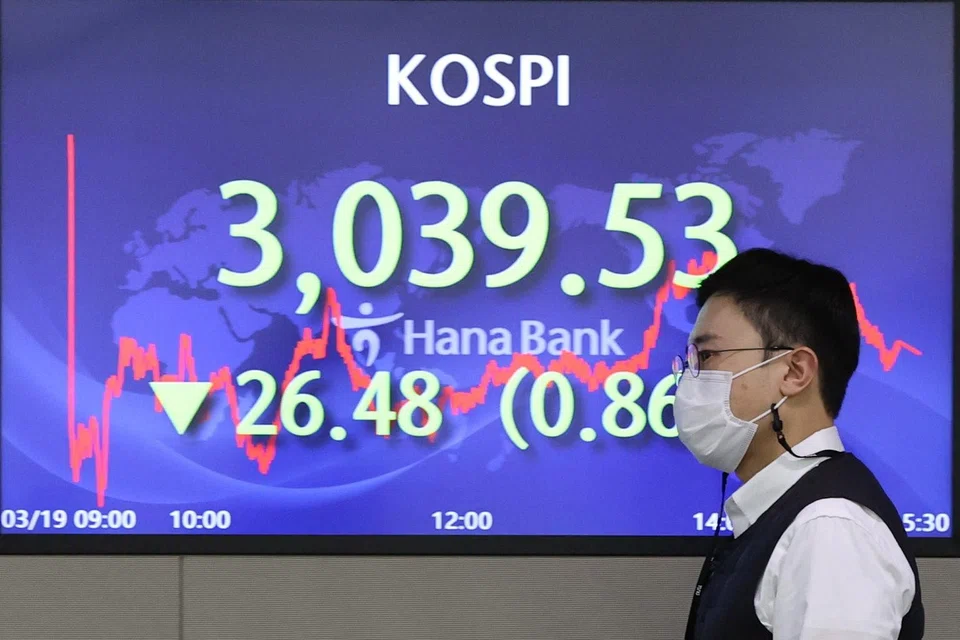 The Kospi closed down 26.48 points, or 0.86 per cent at 3,039.53, having fallen as much as 1.42 per cent. The benchmark index posted a weekly decline of 0.49 per cent, reversing a 0.93 per cent gain a week earlier.