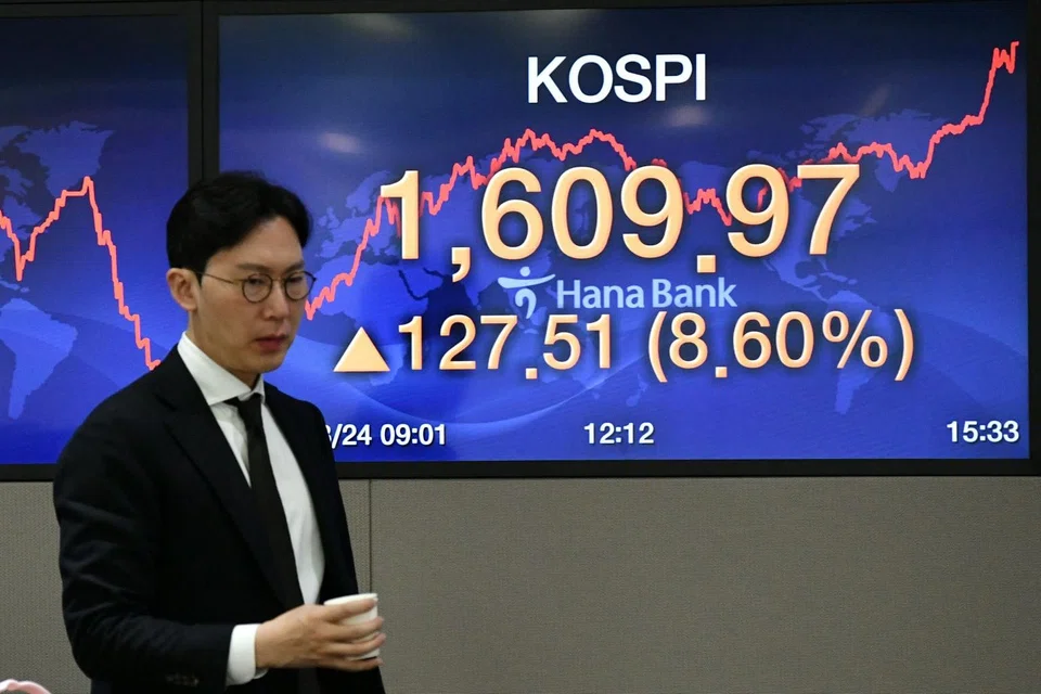 Foreigners were net sellers of 54.6 billion won (S$62.8 million) worth of shares on the main board. The won was quoted 0.6 per cent higher at 1,236.8 per US dollar on the onshore settlement platform.