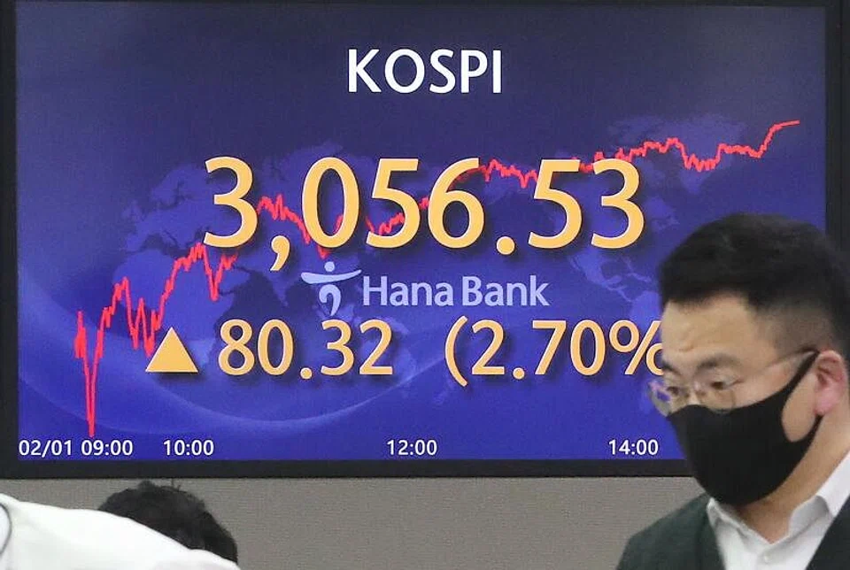 The benchmark Kospi rose 80.32 points, or 2.70 per cent, to 3,056.53, marking the biggest daily gain since Jan 8.