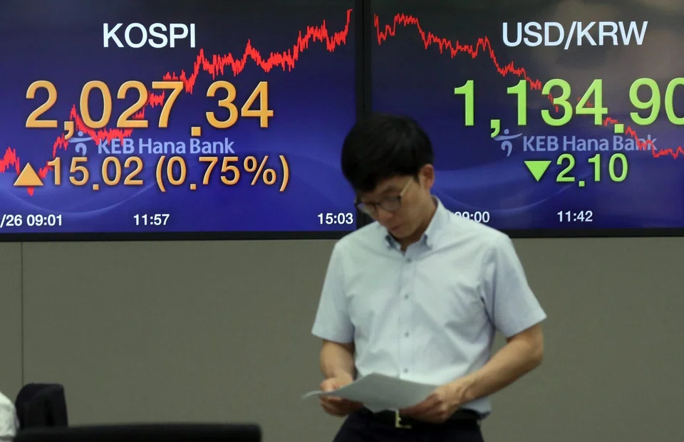 Foreign investors sold a net 7.7 billion Korean won (S$9.06 million) worth of Kospi shares near mid-session, weighing on the index.