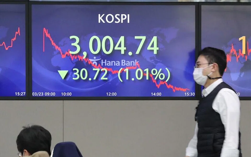 The Kospi closed down 8.39 points, or 0.28 per cent, at 2,996.35, its lowest since March 10. It fell as much as 1.12 per cent in early trade.