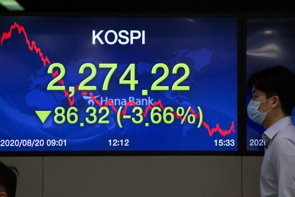 [SEOUL] South Korean shares fell as much as 1.3 per cent on Wednesday on worries of tougher social distancing rules after a rise in domestic coronavirus infections and as bleak US data raised worries of a global economic recovery.
