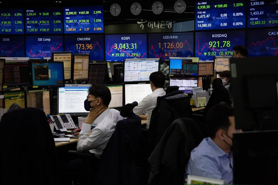 The Kospi was down 41.90 points or 1.4 per cent at 3,001.59, as of 0246 GMT, after declining as much as 2 per cent in early trade to its lowest intraday level since Feb 1. The index is poised for a weekly gain of 0.2 per cent.