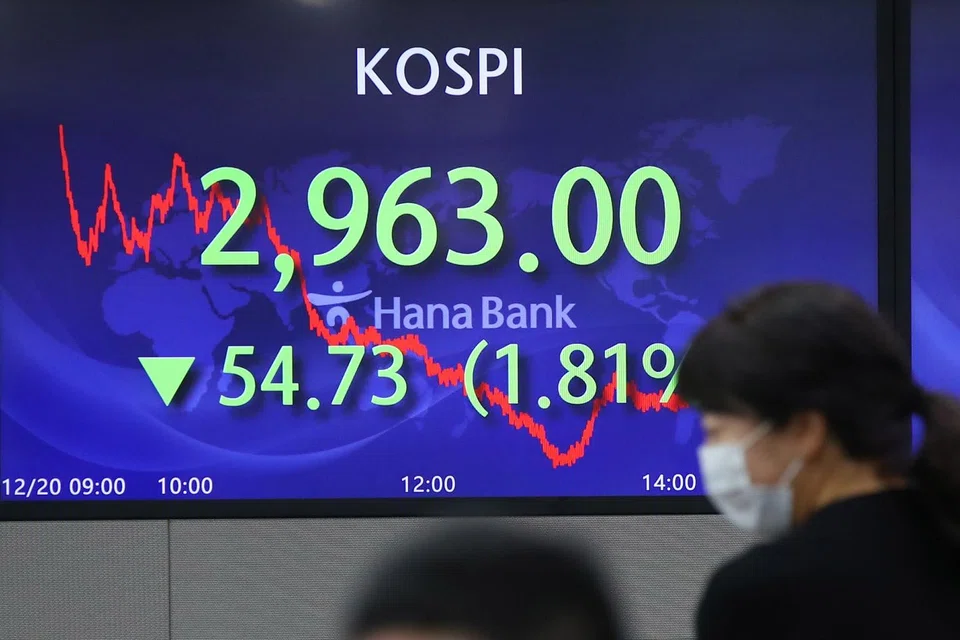 [SEOUL] South Korean shares on Monday (Dec 20) posted their worst session in 3 weeks as worries about the Omicron coronavirus variant and tighter curbs in Europe triggered a steep sell-off by foreign investors. Both the Korean won and the benchmark bond yield fell.