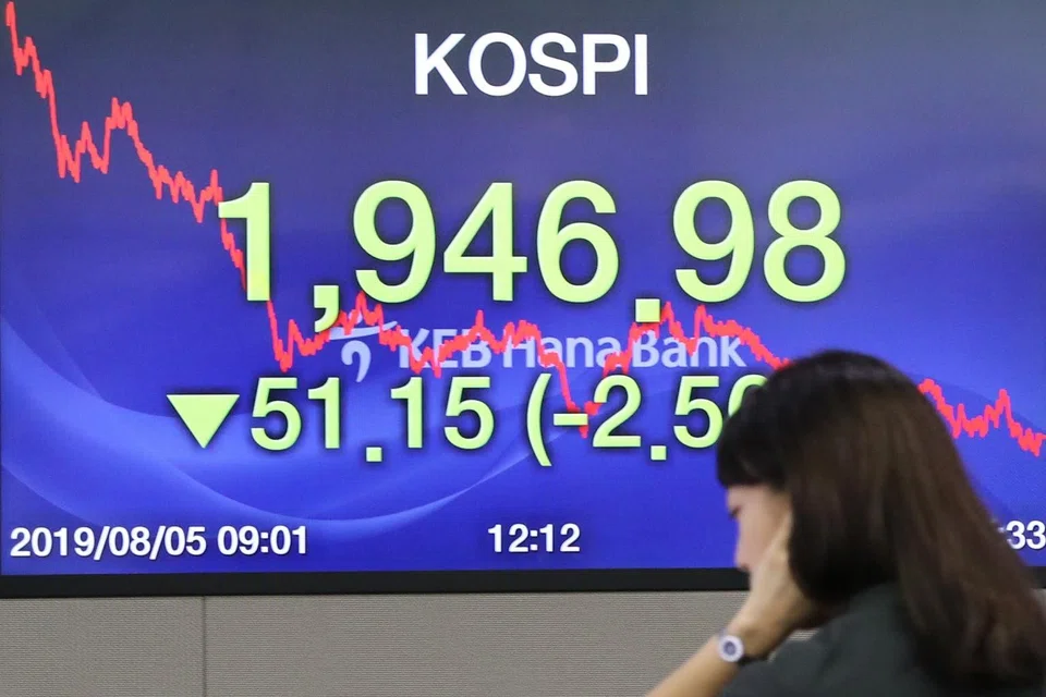 The Seoul stock market's main Kospi index closed down 51.15 points or 2.56 per cent at 1,946.98, marking its sharpest daily percentage loss since May 9. Tech giant Samsung Electronics fell 2.2 per cent, extending losses from last week when it reported a plunge in profit and warned Japanese curbs on the export of chipmaking materials was blurring its outlook.