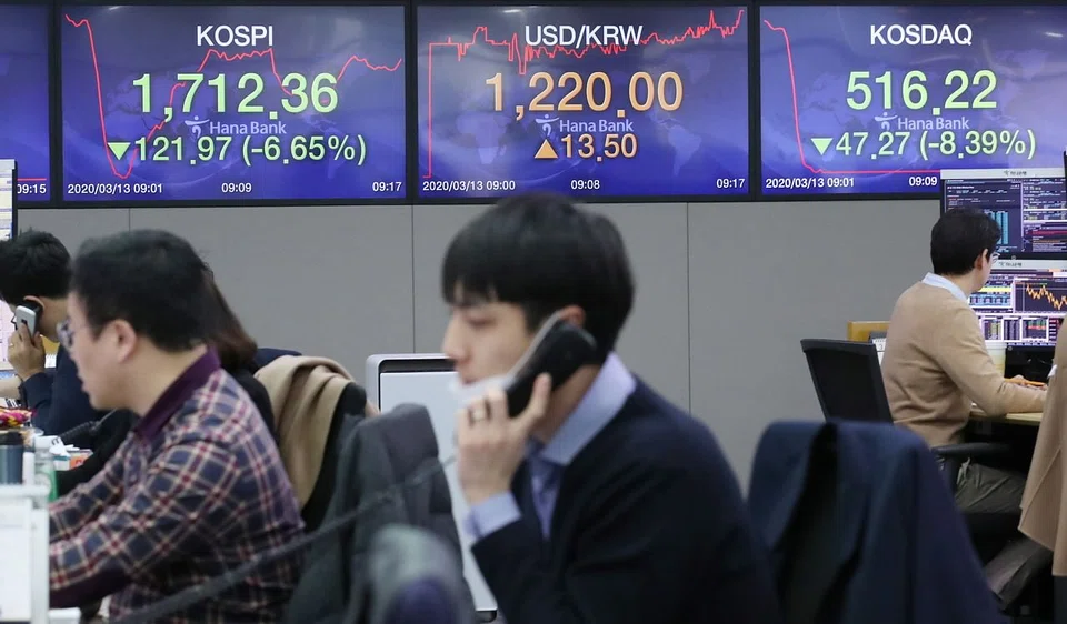 [SEOUL] South Korean shares plunged to a near 10-year-low on Tuesday, following a historic rout on Wall Street, on fears of the coronavirus that poses a major threat to economic growth and as actions from major central banks failed to encourage investors.