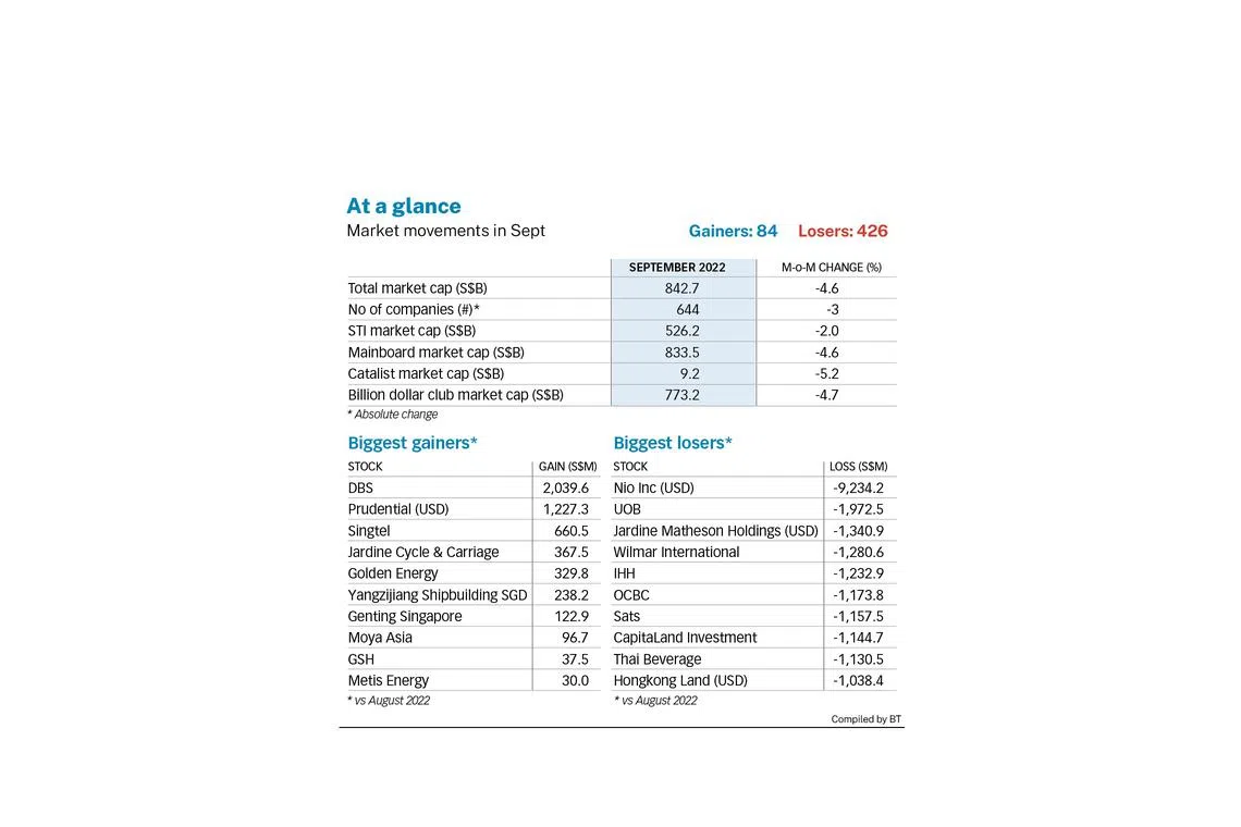 A total of 426 counters were lower while there were only 84 gainers, as the market capitalisation of 644 companies listed in the Republic slid 4.6 per cent over the month from S$883.5 billion to S$842.7 billion.