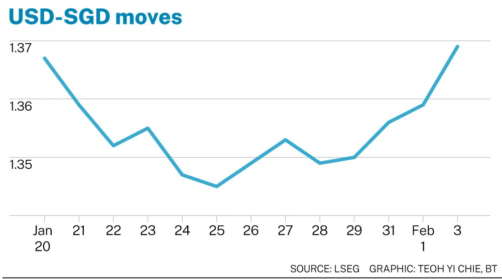 Losses had started gaining steam on Friday. UOB noted in a Feb 3 note that the Japanese yen led losses within the group of G10 currencies on Friday, with the US dollar rising 0.6 per cent. The greenback strengthened the most – gaining 1.45 per cent – against the Malaysian ringgit.