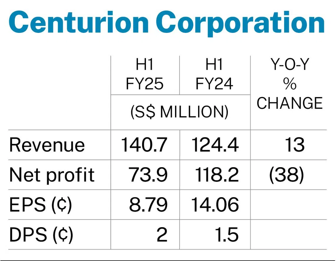Centurion’s earnings per share slid from S$0.1406 to S$0.0879. Net asset value per share was S$1.44 as at end June, marginally higher than S$1.37 as at end-December 2024.