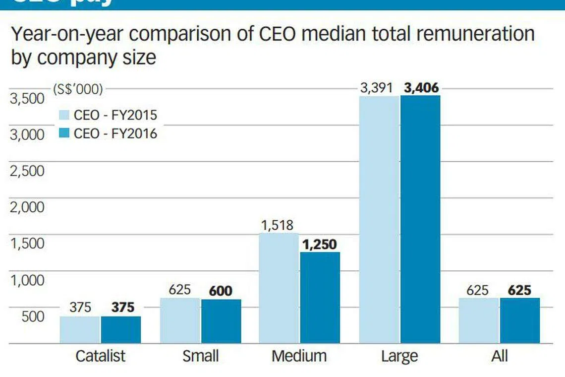 The median total pay for CEOs in Singapore-listed companies stayed flat at S$625,000 per annum between FY2015 and FY2016. The lowest CEO pay in the sample was S$45,849 and the highest, S$12,693,400.