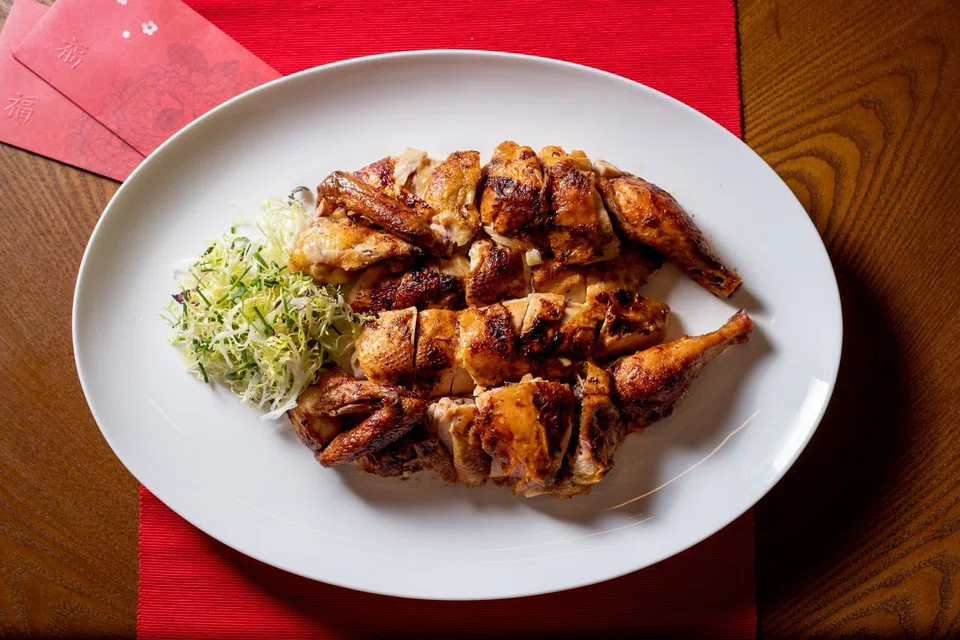 The nine-course dinner menu is priced at S$788++ (per table of 10 persons) including a complimentary dish worth S$80++. The dishes are Prosperity Norwegian Salmon Yu Sheng; Sea Treasures Soup with Fish Maw, Conpoy and Crabmeat; Steamed Garoupa with Greens and Superior Soy Broth; Crispy Roasted Chicken (Complimentary Dish); Poached Tiger Prawn with Herbal Essence; Glazed Prime Pork Rib with Zhenjiang Sauce; 12-head Abalone with Dried Oyster, Braised Chinese Mushroom and Spinach; Chinese Cured Meat Rice; and Mango Sago Pomelo.