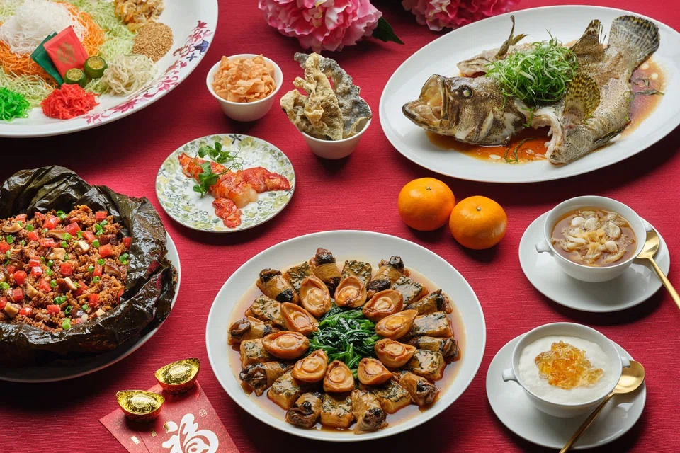 Available from Jan 28 to 30 and Feb 1 to 5, two menus will be offered. The seven-course lunch menu is priced at S$688++ (per table of 10 persons) including a complimentary dish worth S$80++. Dishes comprise Prosperity Norwegian Salmon Yu Sheng; Double-Boiled Chicken and Ginseng Broth; Steamed Barramundi with Greens and Superior Soy Broth; Crispy Roasted Chicken (Complimentary); Poached Tiger Prawn with Herbal Essence; Lotus Leaf Rice with Mushroom, Chinese Sausage and Dried Shrimp; and Mango Sago Pomelo.