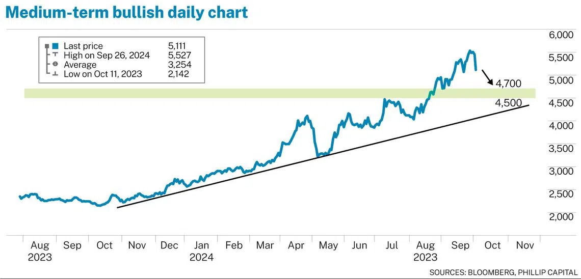 From a technical perspective, coffee prices have been on a constant rise with “higher highs and higher lows” throughout 2024. The necessary consolidation to sustain an 80 per cent surge is missing in the current upswing in coffee prices. It is usually difficult to forecast price projections when a commodity surges into uncharted territories. For now, if we plot an uptrending line (black) joining lows from November 2023 to the present, a technical pullback could be imminent, with immediate support around the 4,500 to 4,700 zone.