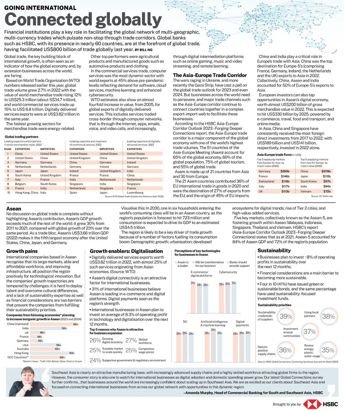 Global banks such as HSBC, with its presence in nearly 60 countries, are at the forefront of global trade, having facilitated US$800 billion of trade globally last year. BY BILL NG