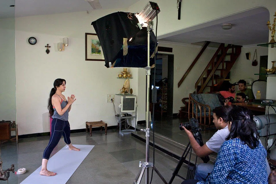 "Imagine you're a horse - you have a lovely mane flowing behind you - looking up towards the ceiling," Ms Jamwal urged in a soothing voice. "Take two more breaths here." As she slid her body into a plank pose, the director yelled, "Cut!" and everyone took a five-minute break.