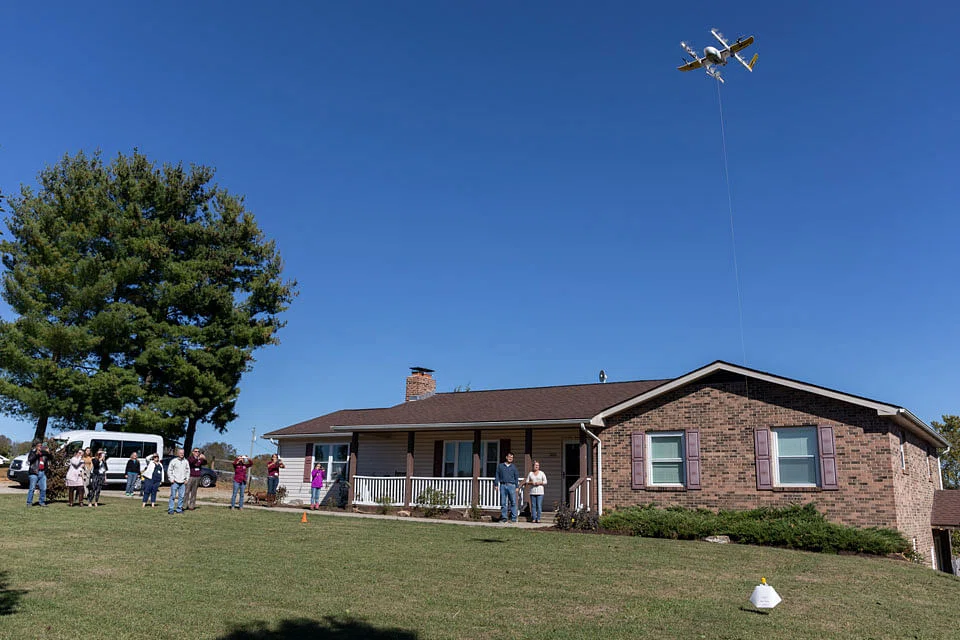 The aircraft - operated by Wing, an offshoot of Google's parent company - approached with a high-pitched whine, hovered in the clear sky above their front lawn and gently lowered a FedEx box containing a new puffy vest for Susie.