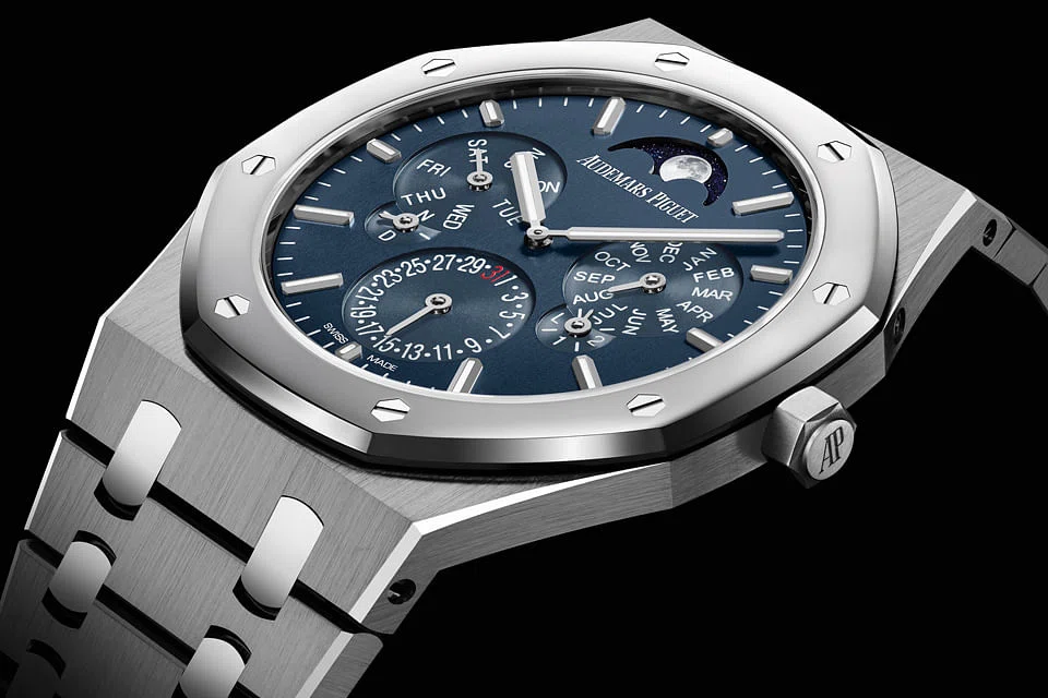 Also a perpetual calendar but innovative in a different manner is the Audemars Piguet Royal Oak Perpetual Calendar Ultra-Thin. Previewed last year as the Royal Oak RD#2 concept watch, the new perpetual calendar is the thinnest perpetual calendar watch in the world, thanks to a clever construction of the movement that spreads out the components instead of stacking them up. It's a remarkably refined 6.3mm high, making it difficult to believe it is a full calendar that includes a leap year and moon phase.