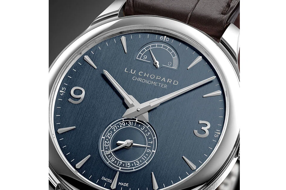 * LUC Quattro: The first edition of this elegant, ultra-thin (8.84 millimetres high) watch appeared last year. It has a silver-toned vertical stain-brushed white dial with blue hands and hour-markers in a rose gold case. The new edition, limited to 50 pieces, features a blue dial dressed in a 43mm wide white gold case. The differences between the two watches stop there.