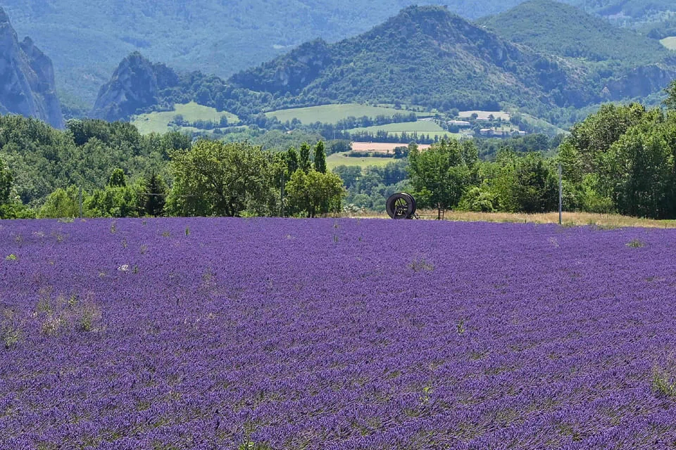 Also nearby, fields of lavandin, a hybrid variety that provides greater quantity and resists bacteria, soak up the sun against a muted backdrop of the Vercors mountain range.
