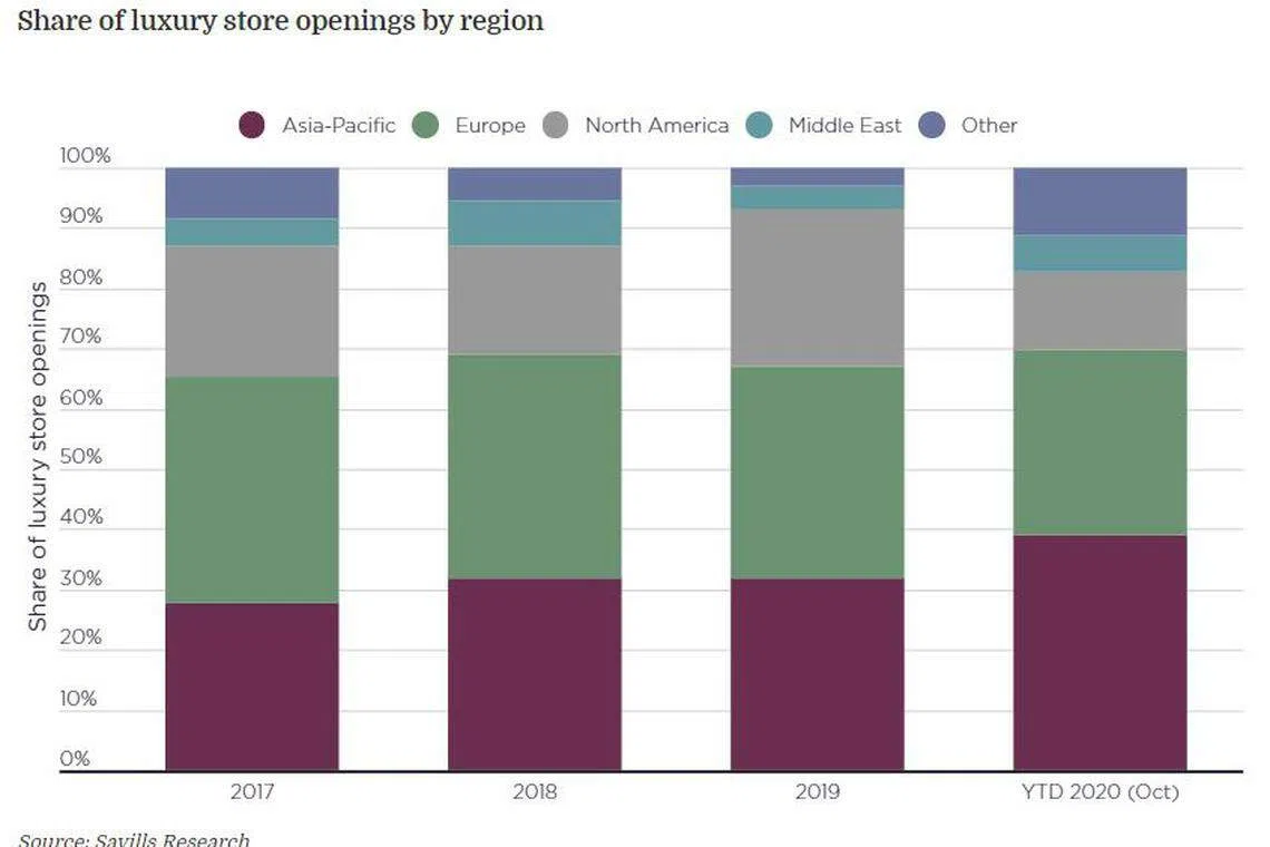 "For a number of years, APAC has provided luxury brands with a key contribution to their global business," said Anthony Selwyn, head of Savills' prime global retail team.